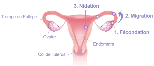 La fécondation de l’ovule par le spermatozoïde se produit au niveau des trompes de Fallope. L’œuf va ensuite migrer vers l’utérus pour s’implanter dans la muqueuse. C’est la nidation.